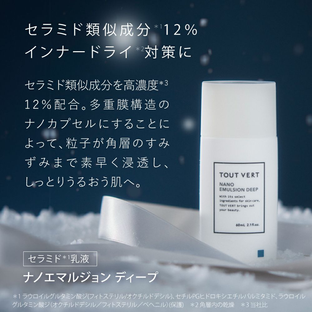 ナノ化したセラミドとワセリン*21が角層へ瞬時に浸透*15し、うるおいを逃がさない、健やかでツヤのある素肌へ導きます。 |