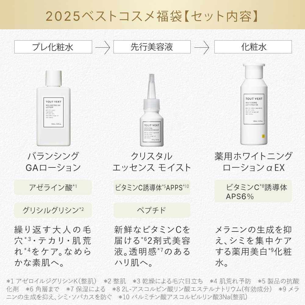 水 、BG、グリセリン、α-アルブチン、3-O-エチルアスコルビン酸、パンテノール、水添レシチン、フェニルエチルレゾルシノール、グラブリジン、カンゾウ根エキス 、サクシノグリカン、ヒアルロン酸Na、シロキクラゲ多糖体、マルチトール、ヒナギク花エキス、オウゴン根エキス、アロエベラ葉エキス、クズ根エキス、クロレラエキス、セイヨウオオバコ種子エキス、ブドウつるエキス、シリカ、EDTA-2Na、クエン酸、クエン酸Na、カラメル、加水分解ローヤルゼリータンパク、カッパフィカスアルバレジエキス、メチルパラベン、プロピルパラベン