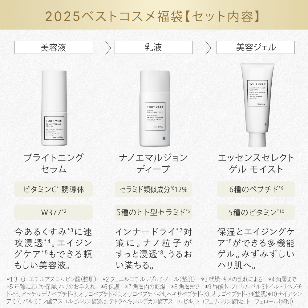 水、PEG/PPG/ポリブチレングリコール-8/5/3グリセリン、DPG、グリセリン、トコフェリルリン酸Na、BG、ポリソルベート20、ナイアシンアミド、3-O-エチルアスコルビン酸、水添レシチン、酢酸N-プロリルパルミトイルトリペプチド-56、パルミトイルトリペプチド-1、パルミトイルトリペプチド-38、パルミトイルテトラペプチド-7、タウリン、リシンHCl、アラニン、ヒスチジンHCl、アルギニン、セリン、プロリン、グルタミン酸、トレオニン、バリン、ロイシン、グリシン、アラントイン、イソロイシン、フェニルアラニン、セラミドEOP、セラミドNG、セラミドAP、セラミドAG、セラミドNP、ジラウロイルグルタミン酸リシンNa、フィトステロールズ、スイゼンジノリ細胞外多糖体、キハダ樹皮エキス、ビサボロール、グリチルリチン酸2K、フラーレン、PVP、カルボマー、ヒドロキシエチルセルロース、ヒドロキシプロピルシクロデキストリン、ペンチレングリコール、カプリリルグリコール、1,2-ヘキサンジオール、ペンテト酸5Na、クエン酸、クエン酸Na、エチルヘキシルグリセリン