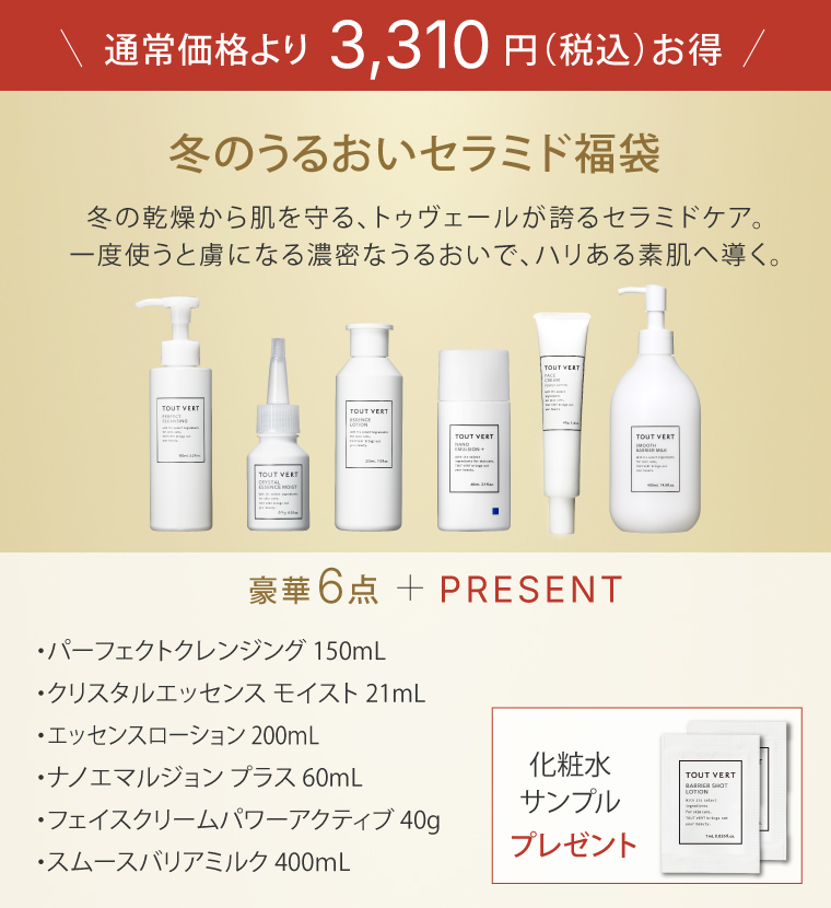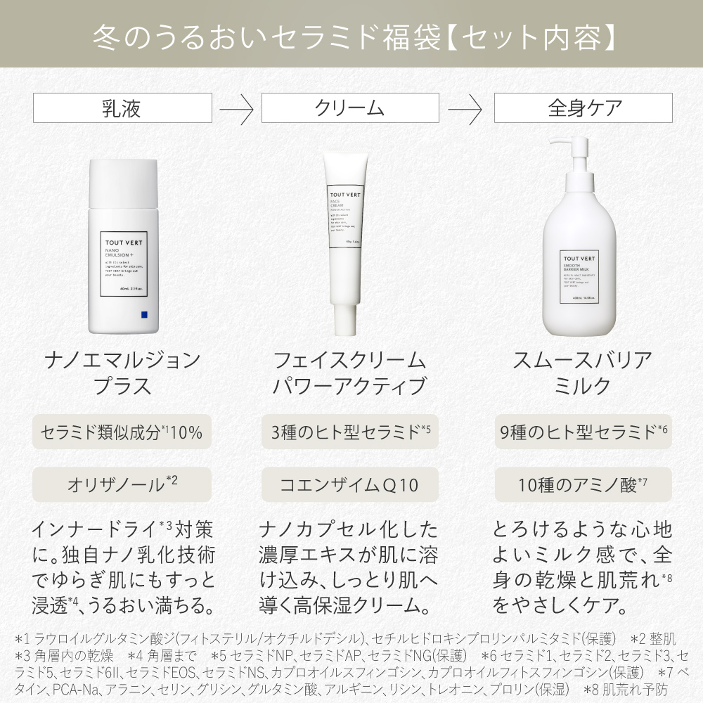 水、BG、グリセリン、ベタイン、トレハロース、ペンチレングリコール、PCA-Na、ラフィノース、水添レシチン、ポリグルタミン酸、グリコシルトレハロース、ヒドロキシプロリン、スクワラン、加水分解ヒアルロン酸、セリン、グリシン、グルタミン酸、アラニン、トレオニン、アルギニン、リシン、プロリン、ユズ果実エキス、アセチルグルコサミン、グリセリルグルコシド、コレステロール、キサンタンガム、加水分解水添デンプン、ナットウガム、リン脂質、トコフェリルリン酸Na、ダイズ種子エキス、スフィンゴ脂質、ビルベリー葉エキス、酢酸トコフェロール、センチフォリアバラ花エキス、ソルビトール、マルチトール、ヒト遺伝子組換オリゴペプチド-1、ユビキノン、フェノキシエタノール、クエン酸Na、クエン酸