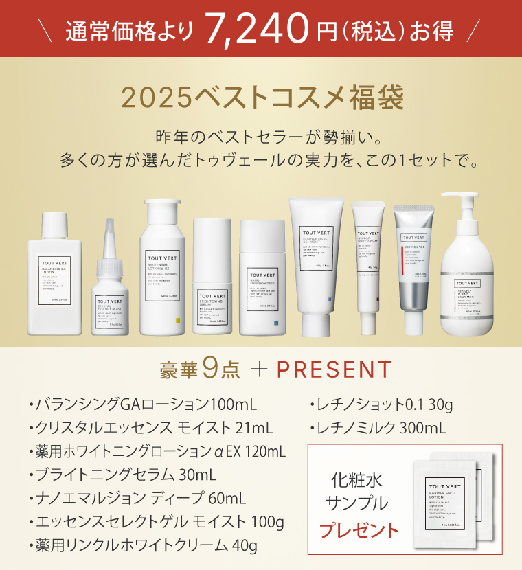 水、ミリスチン酸オクチルドデシル、BG、グリセリン、スクワラン、ジグリセリン、プロパンジオール、イソステアリン酸水添ヒマシ油、水添ナタネ油アルコール、ジメチルイソソルバイド、水添レシチン、フィトステロールズ、レチノイン酸ヒドロキシピナコロン、ヒマワリ種子油、コーン油、トリ(カプリル酸/カプリン酸)グリセリル、パルミチン酸レチノール、レチノイン酸トコフェリル、水添レチノール、レチノール、アセチルシステイン、グルタチオン、セラミドEOP、セラミドNG、セラミドNP、セラミドAG、セラミドAP、アラントイン、ユキノシタエキス、アロエベラ葉エキス、ツボクサ葉エキス、ビルベリー葉エキス、ホップエキス、ビオチン、スイゼンジノリ細胞外多糖体、パルミトイルテトラペプチド-7、パルミトイルトリペプチド-1、酢酸N-プロリルパルミトイルトリペプチド-56、パルミトイルトリペプチド-38、酢酸アミジノベンジルベンジルスルホニルD-セリルホモフェニルアラニンアミド、パルミトイルジペプチド-5ジアミノヒドロキシ酪酸、パルミトイルジペプチド-5ジアミノブチロイルヒドロキシトレオニン、アセチルデカペプチド-3、ヒトオリゴペプチド-1、オリゴペプチド-6、オリゴペプチド-20、ココアンホジ酢酸2Na、トコフェロール、ポリソルベート20、カルボマー、キサンタンガム、ステアリン酸グリセリル、PEG-60水添ヒマシ油、ステアリン酸グリセリル(SE)、カルナウバロウ、フェノキシエタノール、ペンチレングリコール、1,2-ヘキサンジオール、カプリリルグリコール、ヒドロキシプロピルシクロデキストリン、BHT、ジメチコン、フェルラ酸エチル、乳酸Na、クエン酸、PVP、フラーレン、水酸化K