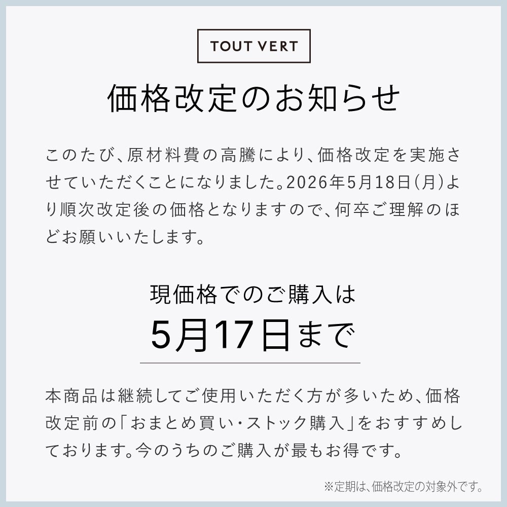 * 石油系界面活性剤、紫外線吸収剤、合成着色料(タール色素)、合成香料、鉱物油 不使用