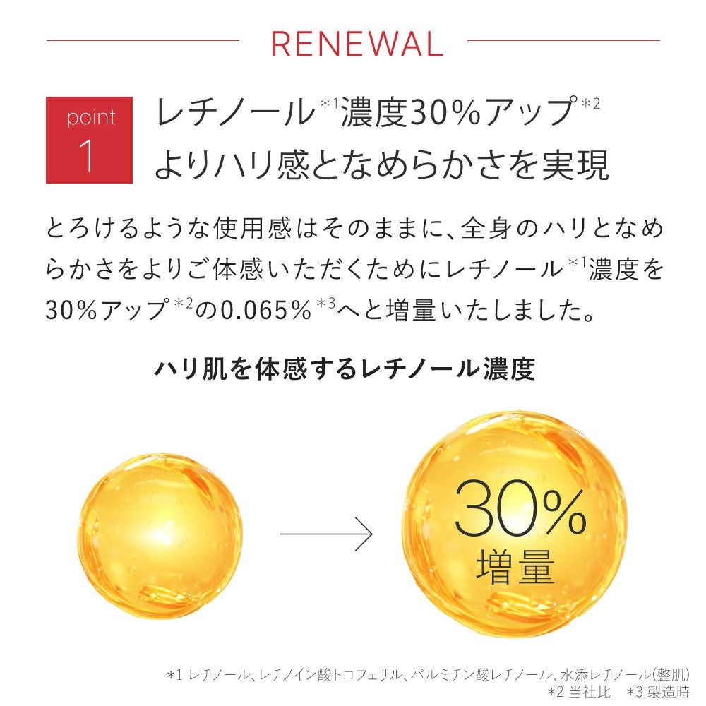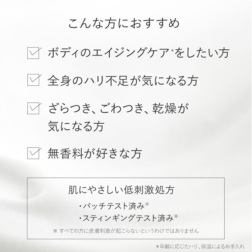 ピュアレチノール*1配合の本格エイジングケア*2ボディミルク。セラミドストック処方で全身をうるおし、もちっと弾むハリ肌へ。 |