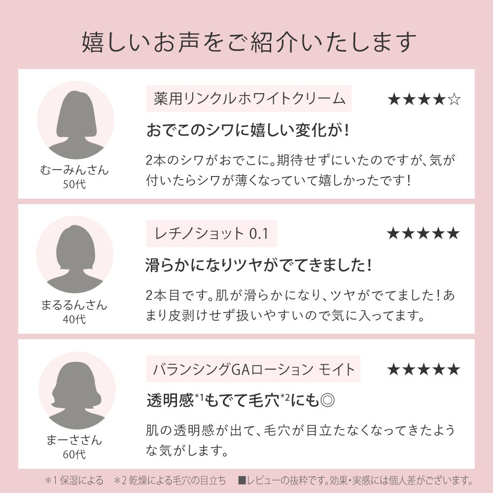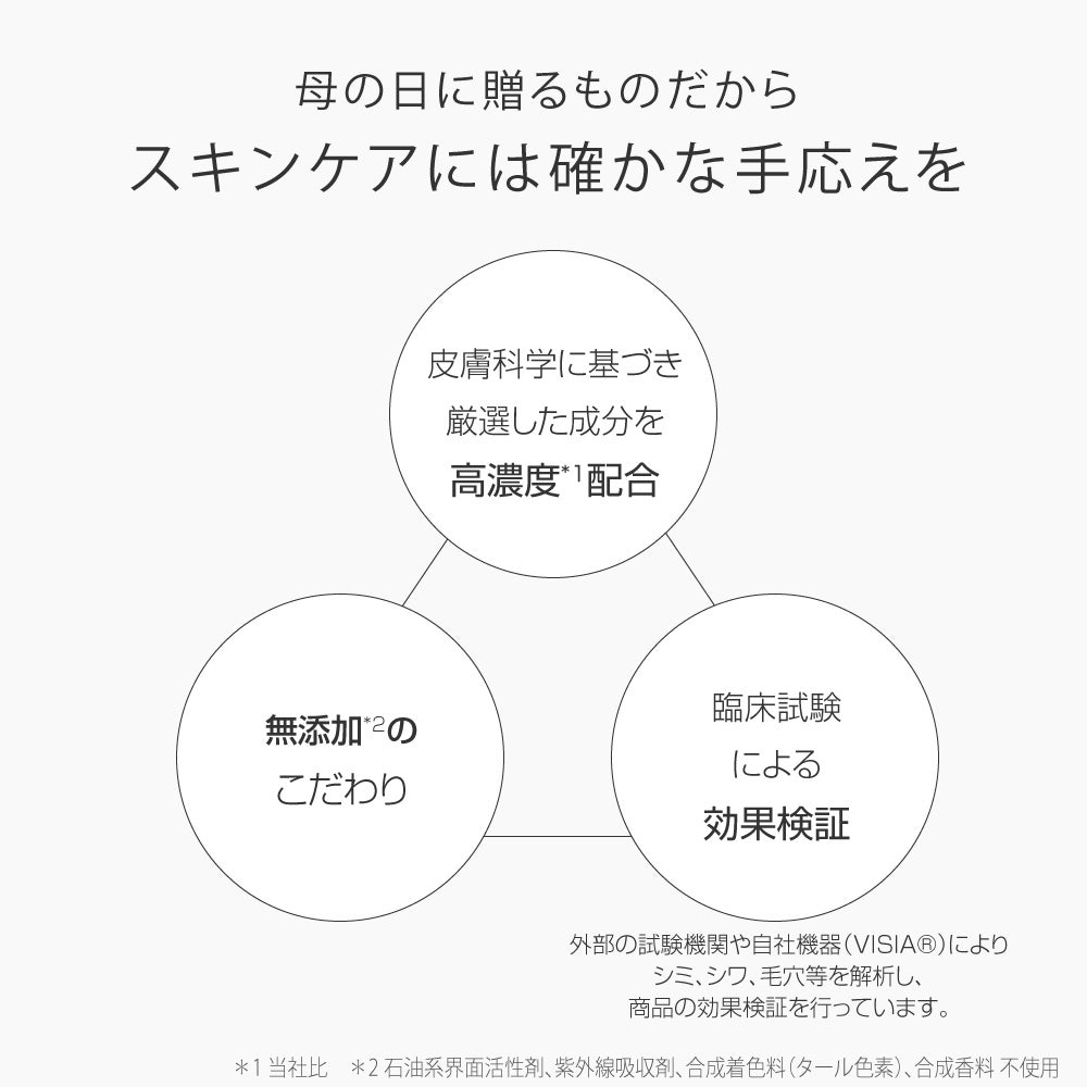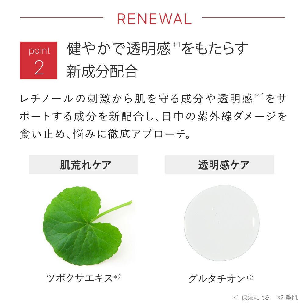 *1 レチノール(整肌) *2 年齢に応じたハリ、保湿によるお手入れ *3 レチノール、レチノイン酸トコフェリル、パルミチン酸レチノール、水添レチノール(整肌) *4 セラミドEOP、セラミドNG、セラミドNP、セラミドAG、セラミドAP(保護) *5 当社比 *6 グリチルレチン酸ステアリル(整肌) *7 乾燥・キメの乱れによる *8 グルコシルヘスペリジン、トコフェロール(整肌) *9 ラウロイルグルタミン酸ジ(フィトステリル/オクチルドデシル)、ラウロイルグルタミン酸ジ(オクチルドデシル/フィトステリル/ベヘニル)、セチルPGヒドロキシエチルパルミタミド、セラミドEOP、セラミドNG、セラミドAP、セラミドAG、セラミドNP(保護) *10 整肌 *11 セラミド1、セラミド2、セラミド3、セラミド5、セラミド6Ⅱ、セラミドEOS、セラミドNS、カプロオイルスフィンゴシン、カプロオイルフィトスフィンゴシン(保護) *12 肌荒れ予防 *13 ベタイン、PCA-Na、アラニン、セリン、グリシン、グルタミン酸、アルギニン、リシン、トレオニン、プロリン(保湿) *14 セラミドNG、セラミドNP、セラミドAP(保護) *15 ラウロイルグルタミン酸ジ(フィトステリル/オクチルドデシル)(保護) *16 光毒性の成分を除去した精油を採用しております