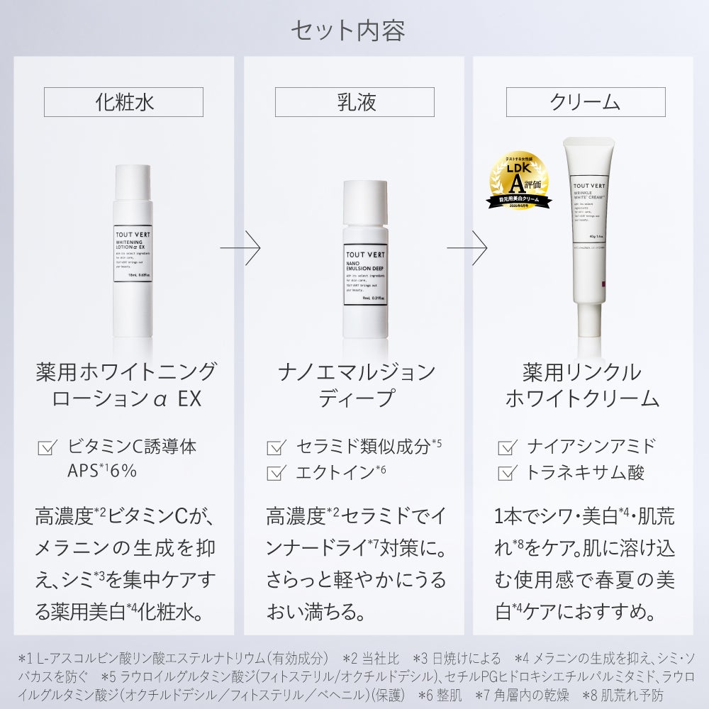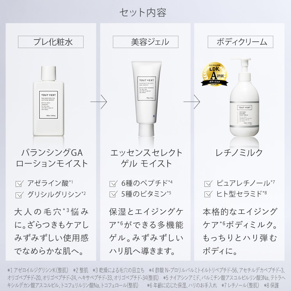*1 石油系界面活性剤、紫外線吸収剤、合成着色料(タール色素)、合成香料、鉱物油、防腐剤、シリコン 不使用 *2 セラミドNG、セラミドNP、セラミドAP(保護) *3 セラミド1、セラミド2、セラミド3、セラミド5、セラミド6Ⅱ、セラミドEOS、セラミドNS、カプロオイルスフィンゴシン、カプロオイルフィトスフィンゴシン(保護) *4 整肌 *5 パルミチン酸アスコルビルリン酸3Na、リン酸アスコルビルMg、テトラヘキシルデカン酸アスコルビル、パルミチン酸レチノール、ナイアシンアミド、ニコチンアミドモノヌクレオチド、トコフェロール、酢酸トコフェロール(整肌) *6 年齢に応じた保湿、ハリのお手入れ