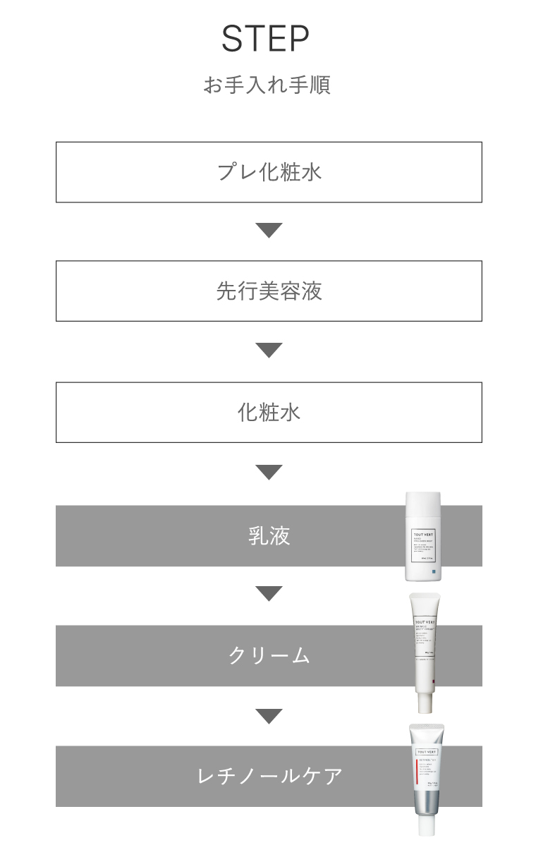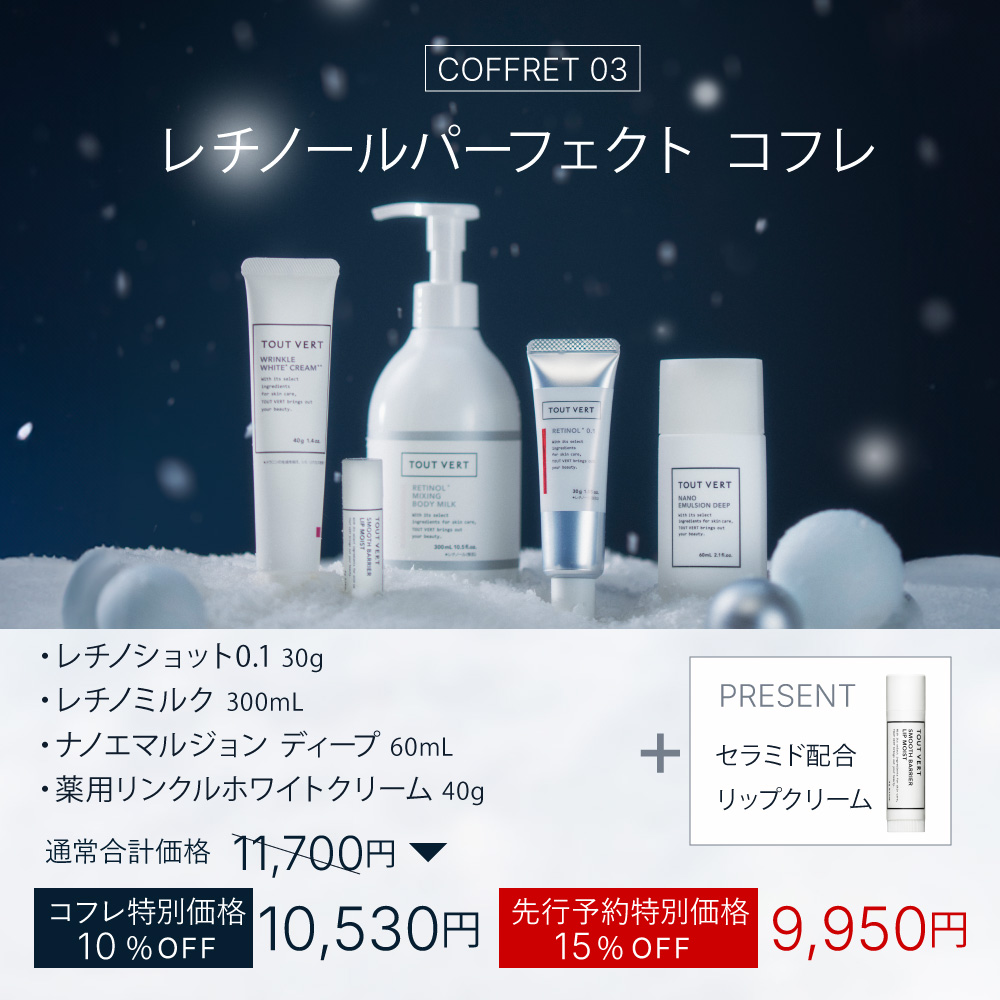 水、ミリスチン酸オクチルドデシル、BG、グリセリン、スクワラン、ジグリセリン、プロパンジオール、イソステアリン酸水添ヒマシ油、水添ナタネ油アルコール、ジメチルイソソルバイド、水添レシチン、フィトステロールズ、レチノイン酸ヒドロキシピナコロン、ヒマワリ種子油、コーン油、トリ(カプリル酸/カプリン酸)グリセリル、パルミチン酸レチノール、レチノイン酸トコフェリル、水添レチノール、レチノール、アセチルシステイン、グルタチオン、セラミドEOP、セラミドNG、セラミドNP、セラミドAG、セラミドAP、アラントイン、ユキノシタエキス、アロエベラ葉エキス、ツボクサ葉エキス、ビルベリー葉エキス、ホップエキス、ビオチン、スイゼンジノリ細胞外多糖体、パルミトイルテトラペプチド-7、パルミトイルトリペプチド-1、酢酸N-プロリルパルミトイルトリペプチド-56、パルミトイルトリペプチド-38、酢酸アミジノベンジルベンジルスルホニルD-セリルホモフェニルアラニンアミド、パルミトイルジペプチド-5ジアミノヒドロキシ酪酸、パルミトイルジペプチド-5ジアミノブチロイルヒドロキシトレオニン、アセチルデカペプチド-3、ヒトオリゴペプチド-1、オリゴペプチド-6、オリゴペプチド-20、ココアンホジ酢酸2Na、トコフェロール、ポリソルベート20、カルボマー、キサンタンガム、ステアリン酸グリセリル、PEG-60水添ヒマシ油、ステアリン酸グリセリル(SE)、カルナウバロウ、フェノキシエタノール、ペンチレングリコール、1,2-ヘキサンジオール、カプリリルグリコール、ヒドロキシプロピルシクロデキストリン、BHT、ジメチコン、フェルラ酸エチル、乳酸Na、クエン酸、PVP、フラーレン、水酸化K