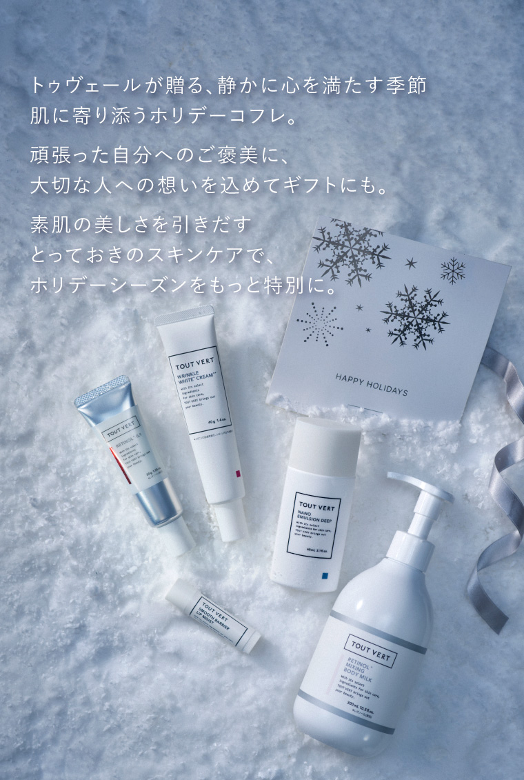 水、グリセリン、DPG、エチルヘキサン酸セチル、スクワラン、ワセリン、トリ(カプリル酸/カプリン酸)グリセリル、ナイアシンアミド、パンテノール、パルミチン酸レチノール、レチノール、レチノイン酸トコフェリル、水添レチノール、グルタチオン、ツボクサエキス、ポリクオタニウム-61、セラミドEOP、セラミドNG、セラミドNP、セラミドAG、セラミドAP、フィトステロールズ、ベタイン、PCA、PCA-Na、アラニン、セリン、グリシン、グルタミン酸、アルギニン、リシンHCl、トレオニン、プロリン、オリザノール、トコフェリルリン酸Na、グリセリルグルコシド、ブドウ果実エキス、ビブリオアルギノリチクス培養液、エーデルワイスカルス培養エキス、マンダリンオレンジ果皮エキス、サガラメエキス、水添レシチン、ベヘニルアルコール、セスキオレイン酸ソルビタン、セテアレス-20、コーン油、BG、異性化糖、乳酸Na、水酸化Na、キサンタンガム、(アクリレーツ/アクリル酸アルキル(C10-30))クロスポリマー、カルボマー、BHT、エチルヘキシルグリセリン、フェノキシエタノール