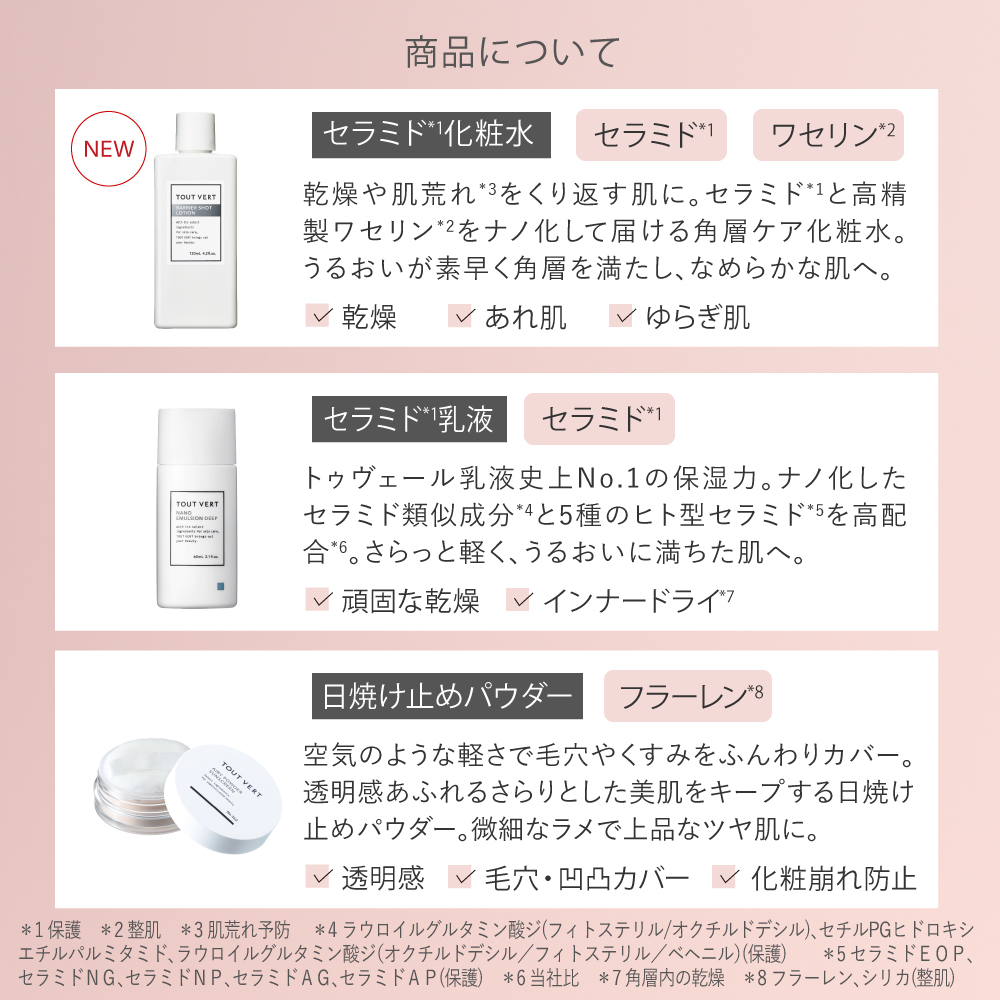 その他の成分:セリサイト、マイカ、窒化ホウ素、無水ケイ酸、酸化チタン、酸化亜鉛、低温焼成酸化亜鉛、微粒子酸化チタン、ミリスチン酸亜鉛、トリ(カプリル・カプリン酸)グリセリル、テトライソステアリン酸ジグリセリル、水素添加大豆リン脂質、フィトステロール、ステアロイルオキシヘプタコサノイルフィトスフィンゴシン、N-ステアロイルジヒドロスフィンゴシン、N-ステアロイルフィトスフィンゴシン、ヒドロキシステアリルフィトスフィンゴシン、エクトイン、D-パントテニルアルコール、ニコチン酸アミド、アスコルビン酸リン酸エステルナトリウム、テトラ2-ヘキシルデカン酸アスコルビル、グルタチオン、L-エルゴチオネイン液、天然ビタミンE、ビサボロール、ステアリン酸、ミリスチン酸マグネシウム、ナイロン末、ポリアクリル酸アルキル、メチルポリシロキサン、メチルハイドロジェンポリシロキサン、架橋型メチルポリシロキサン、架橋型シリコーン・網状型シリコーンブロック共重合体、高重合メチルポリシロキサン(1)、トリメチルシロキシケイ酸、メチルフェニルポリシロキサン、水酸化アルミニウム、黄酸化鉄、ベンガラ、黒酸化鉄